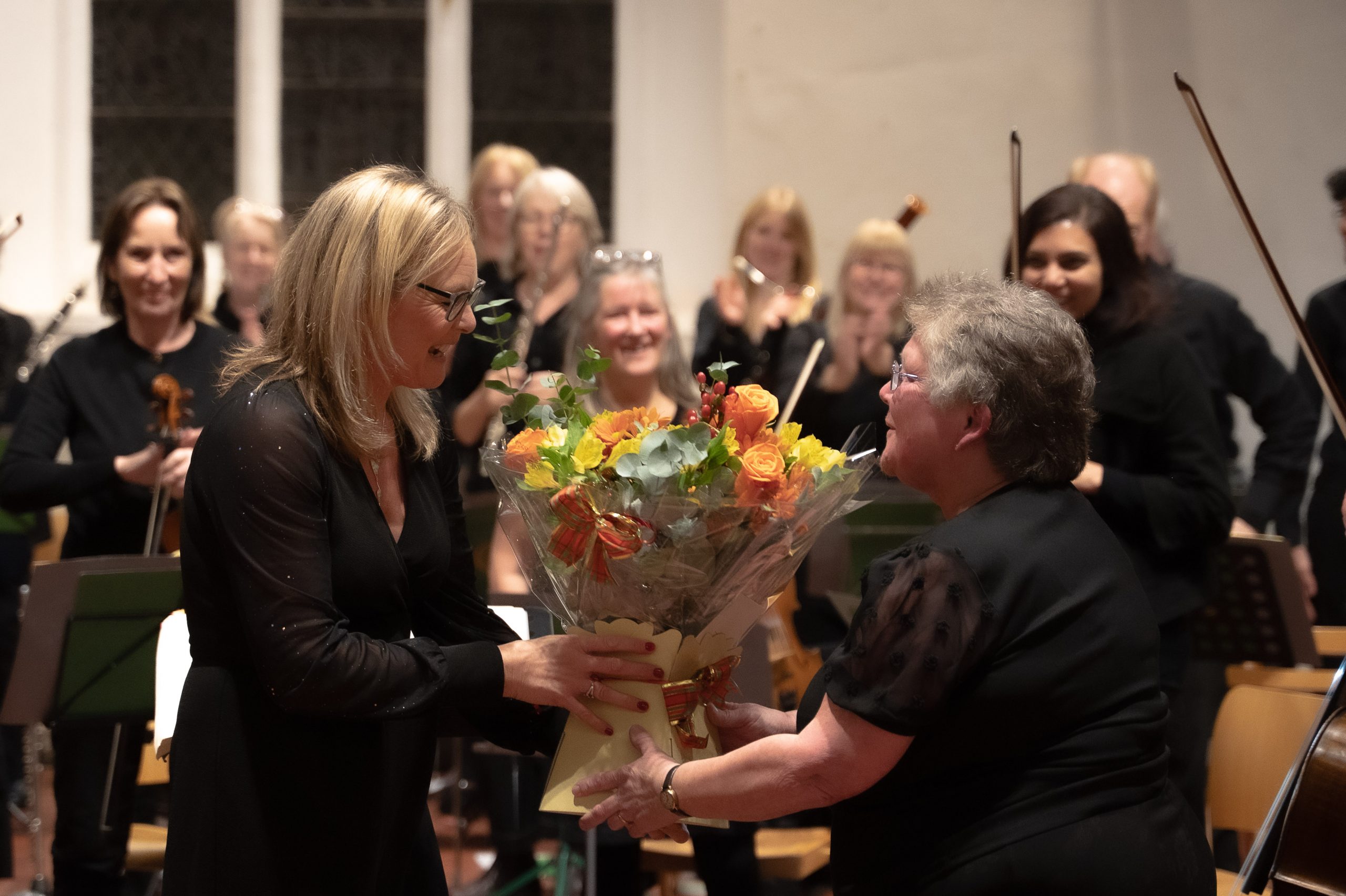 Pictures: Grace Tushingham (oboeist), Caron de Burgh (Guest Conductor) receives flowers from orchestra member Alison Phelps